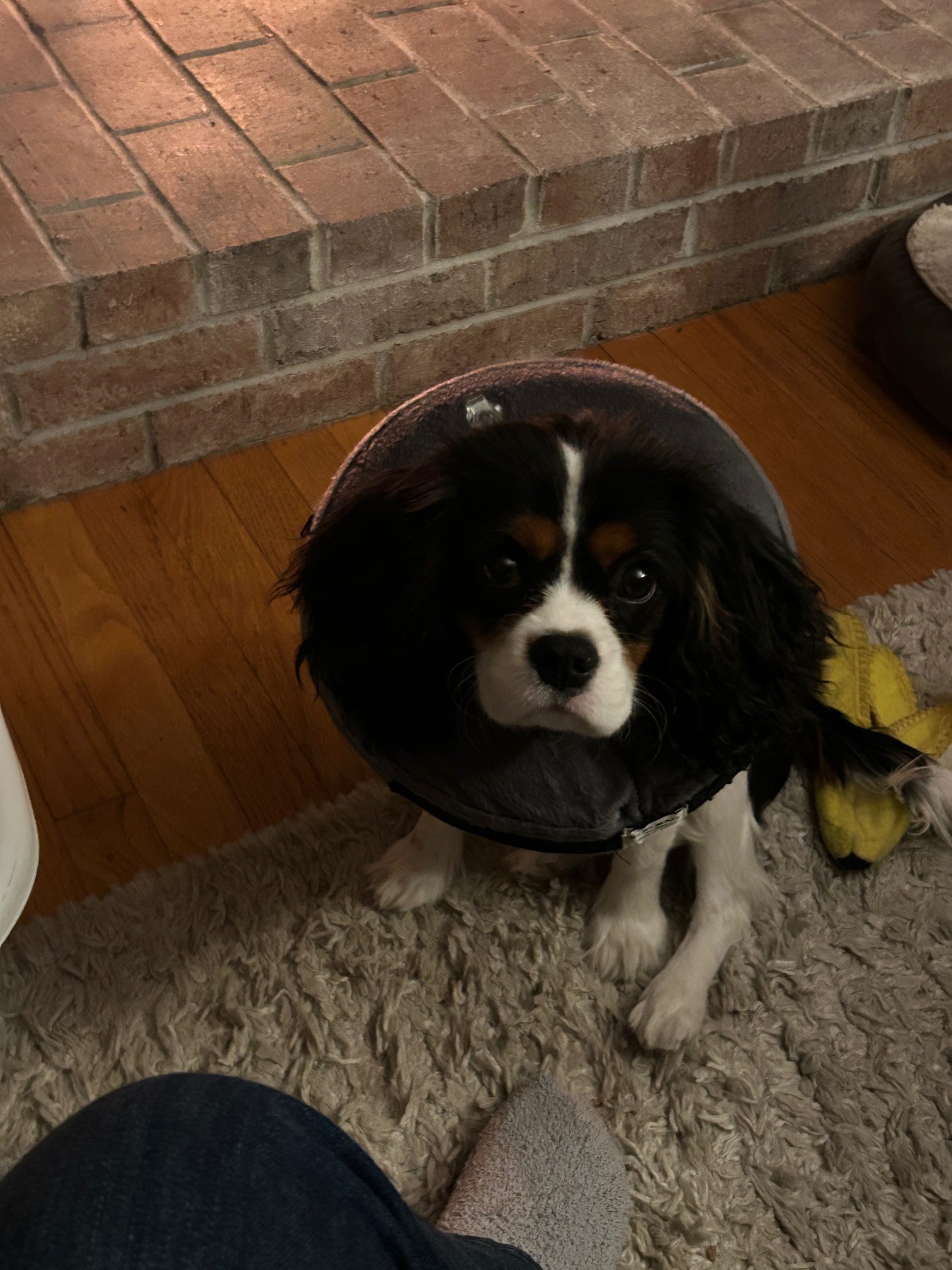 Image description: Black and white puppy looking up at the camera, wearing a gray inflatable ring around his neck.