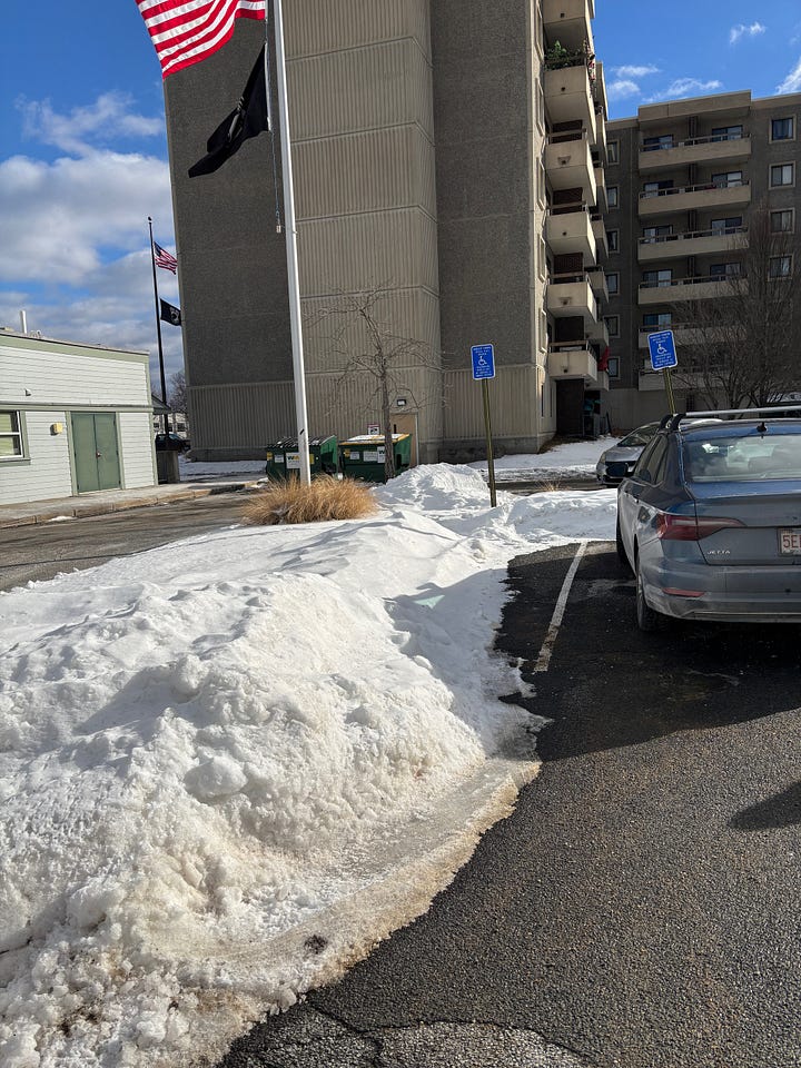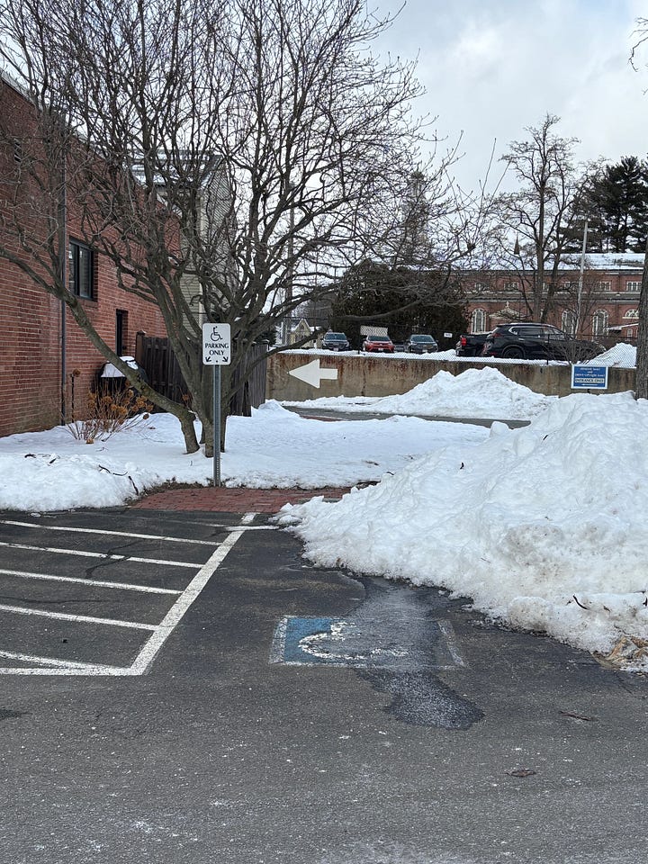 Image description: Left: Black pavement of a parking lot with white paint indicating a disability spot. There is a sign to the side with a disability sign and "Parking Only", but the parking space is half-covered in piled-up snow. There is a building behind it. Right: On the right is a big pile of snow, covering a parking space. A disability parking sign pokes out from the snow. To the right is a car parked in the next spot. I Influenced Someone! OK, sure, he’s my husband and he was probably going to do this anyway, but I told him to make a Substack and that totally counts. I believe I am now officially an Influencer. He writes about difficult contemporary poetry (he would say it’s just poetry, but these are the poets who move beyond first-person immediate reaction poems). He is a professor and I so rarely get to see his work because I haven’t been a student in a really long time. And it’s easy to forget that Super Spouse isn’t his only persona. It’s nice sometimes to think about something other than myself. Sometimes.